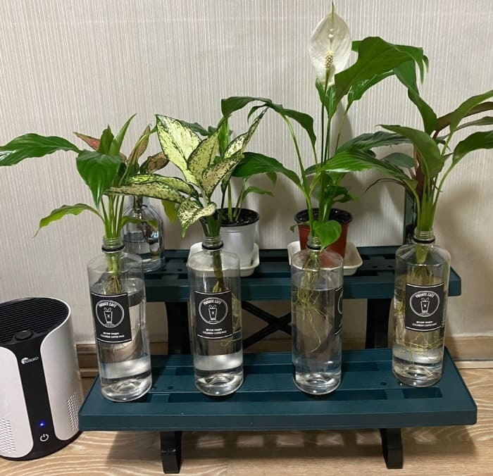 그래도 어찌어찌 나름 완성이 되었습니다. 수경재배로 돌린 것들이 길이가 조금 길어서 앞에 놓았는데 무게를 좀 배분해서 놓아야 할 것 같아요. 무거운 것은 많이 지탱해주지는 못하는 듯 해 가벼운 화분이나 작은 선인장 등 가벼운 것을 놓는 것이 좋을 것 같고 큰 화분은 버티기 힘들 듯합니다.