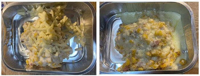 내용물은 매우 단출한 편입니다. 콘 옥수수와 햄, 그리고 마요네즈가 범벅이 되어 있는 주 재료와 뿌려먹는 모짜렐라 치즈가 들어있습니다.