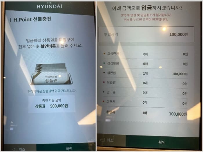 그리고 상품권을 넣고, 금액을 확인한 후 확인을 누르면 충전이 완료됩니다. 한 번에 충전 가능한 금액은 50만 원이라고 하네요.