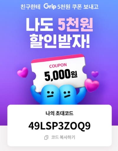 첫 구매를 완료하고 나면 쿠폰이 발급됩니다. 위의 2,500원 쿠폰 두 장은 그립에서 발급해 주는 것이고 맨 아래의 5,000원 쿠폰은 신규 가입 시 추천인을 입력했을 때 발급되는 쿠폰입니다.