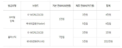 기본 연회비와 제휴 연회비가 있는데 처음 발급받는 경우 한 번에 연회비가 청구되고 저 같은 경우 발급받는 시점에 다른 국민카드를 소지하고 있었는데 KB국민 청춘대로 톡톡카드로 교체 발급받았더니 원래 연회비가 나가던 시점에는 기본 연회비 7천 원이, 그리고 KB 국민 청춘대로 톡톡카드를 발급받은 시점에 제휴 연회비 5천 원이 청구되고 있었습니다.